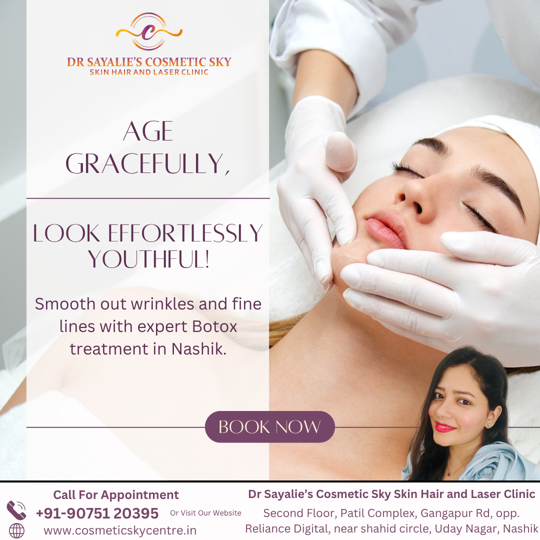 Aging gracefully is possible with modern cosmetic dermatology. The Botox treatment in Nashik at Dr Sayalie’s Cosmetic Sky skin hair and laser clinic helps reduce fine lines and wrinkles, giving you a naturally youthful appearance. This safe and quick procedure is performed by experienced dermatologists using high-quality, medically approved Botox injections.