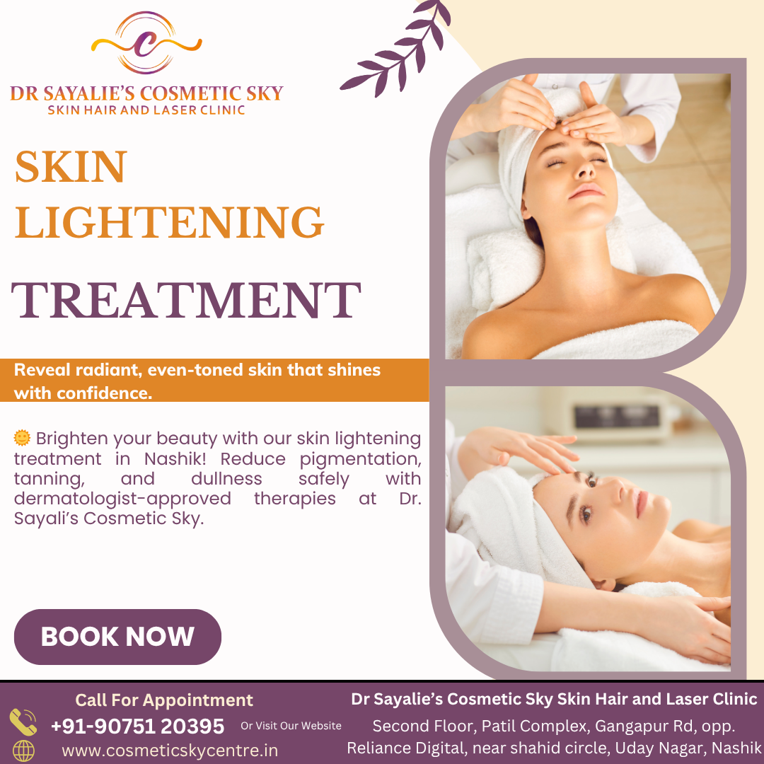Everyone desires an even, radiant complexion that reflects healthy skin. Dr Sayalie’s Cosmetic Sky skin hair and laser clinic offers advanced skin lightening treatment in Nashik designed to reduce pigmentation, tanning, and dullness. Using modern aesthetic technologies and dermatologist-formulated solutions, the clinic helps improve skin tone and restore brightness naturally.